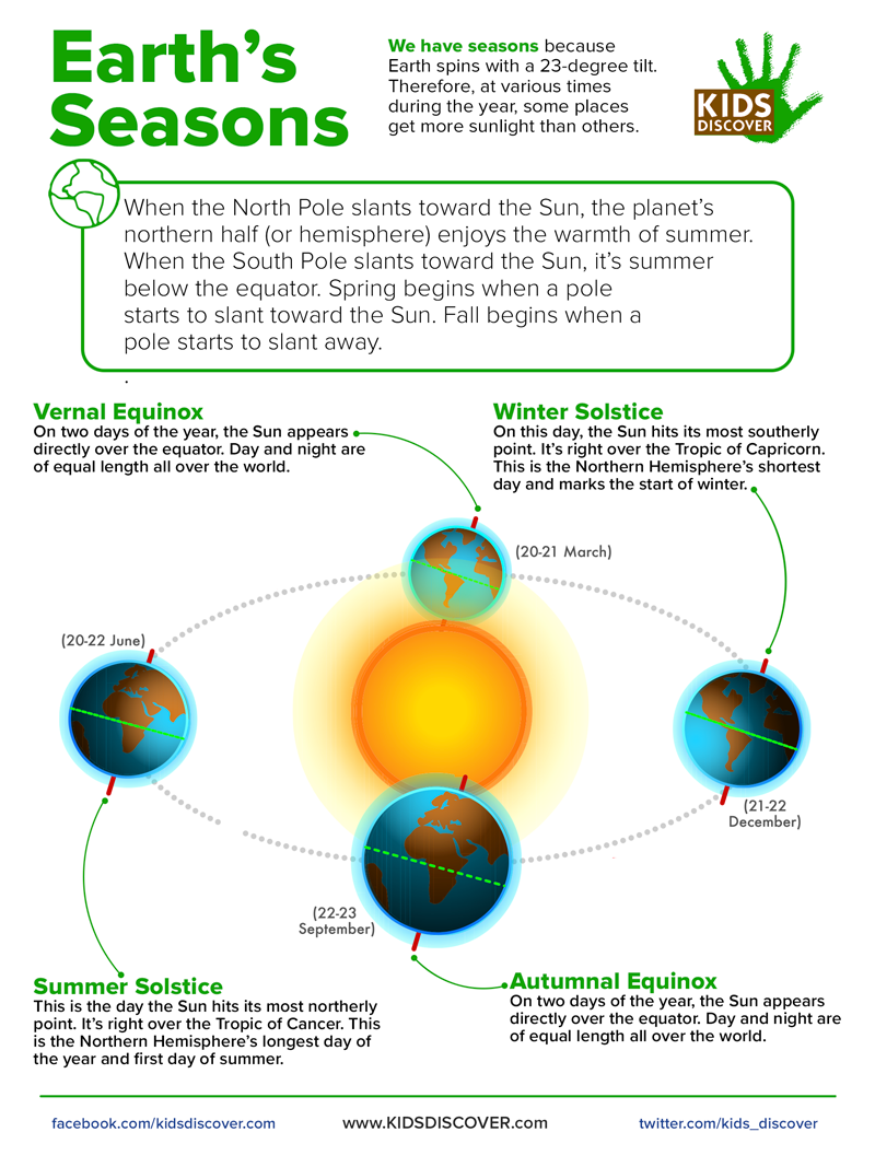 Therefore, at various times during the year, some places get more sunlight than others. When the North Pole slants towards the Sun, the planet's northern half (or hemisphere) enjoys the warmth of summer. When the South Pole slants towards the Sun, it's summer below the equator.
