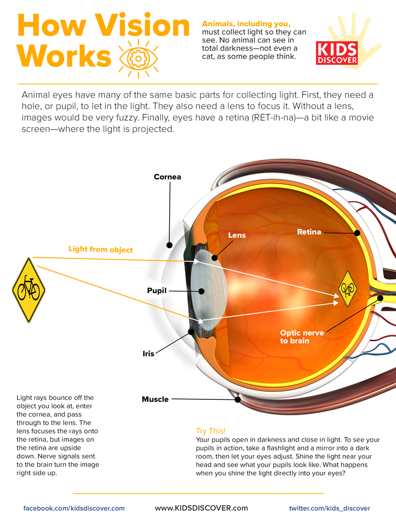 Animal eyes have many of the same basic parts for collecting light. First, they need a hole, or pupil, to let in the light. They also need a lens to focus it. Without a lens, images would be very fuzzy. Finally, eyes have a retina (RET-ih-na)—a bit like a movie screen—where the light is projected.