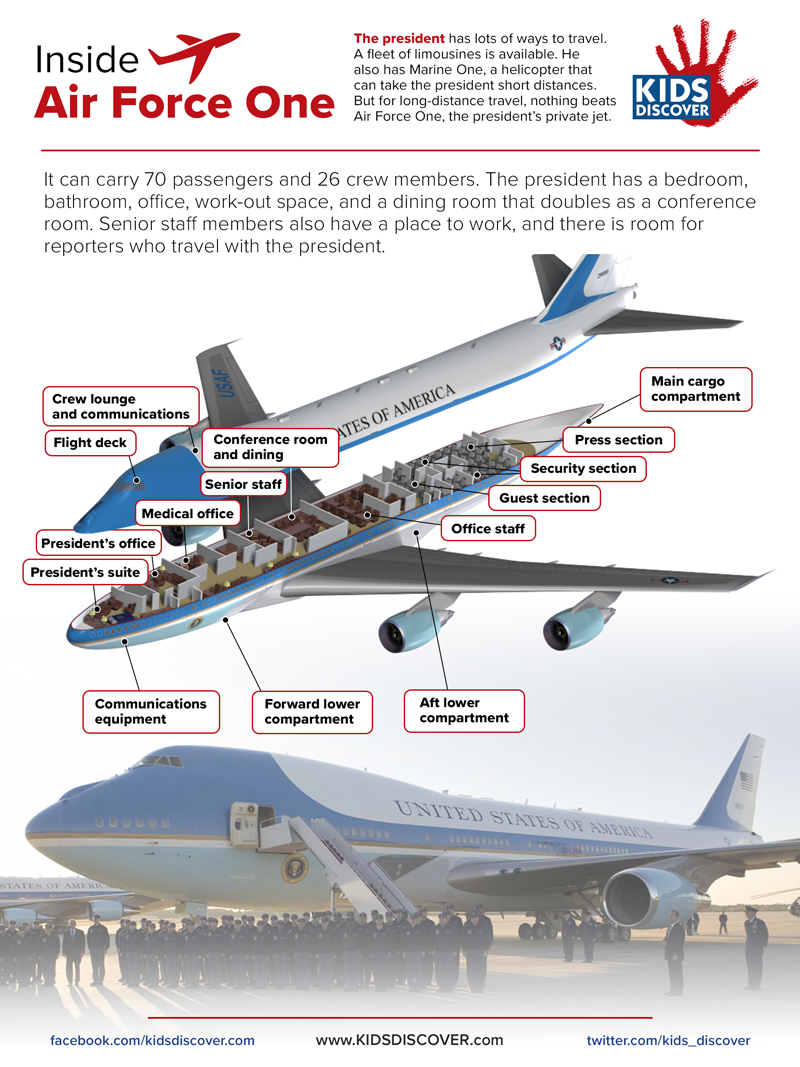 But for long-distance travel, nothing beats Air Force One, the president’s private jet. It can carry 70 passengers and 26 crew members.