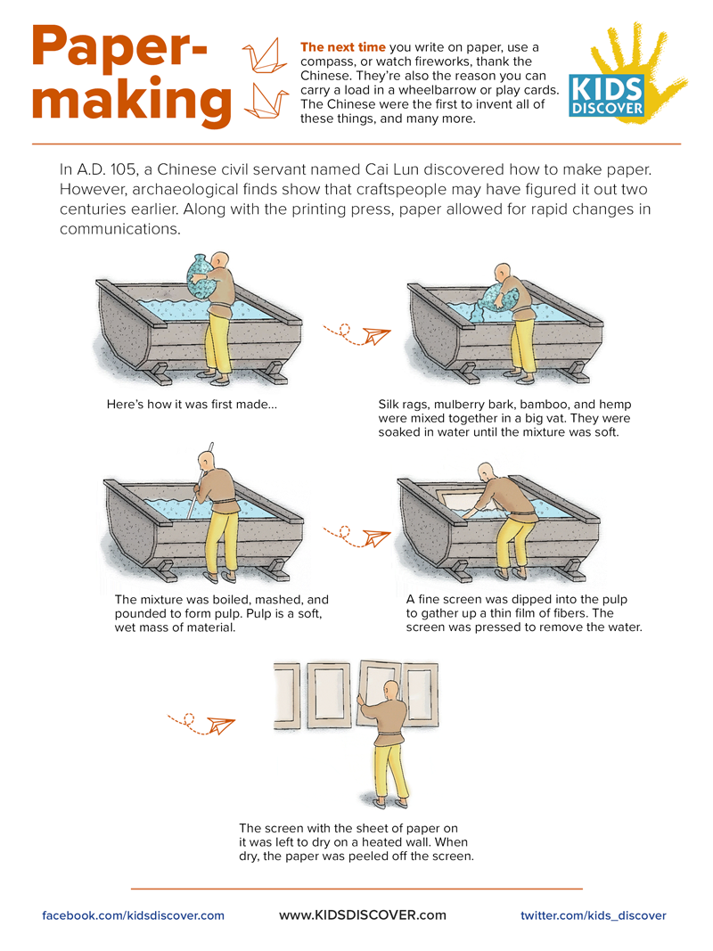 The Chinese were the first to invent all of these things, and many more. In A.D. 105, a Chinese civil servant named Cai Lun discovered how to make paper. Here’s how it was first made...