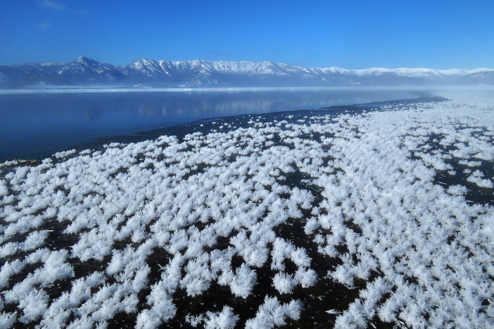 "Frost flowers" in Arctic and Antarctic seas can form on a calm ocean surface when very dry air is much colder than the water.
