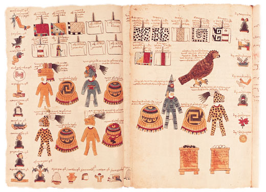 The Aztecs built their empire by conquering other peoples and making them pay tribute. From some they demanded clothing, precious feathers, or jaguar skins. They also took maize, beans, and cacao. From others, they called for gold, turquoise, or jade. Aztec officials came about four times a year to collect tribute. As long as the provinces paid, the Aztecs usually left them alone. Local leaders could rule their people as they pleased. But, if they rebelled and didn’t pay, they were punished. Aztec rulers sent their warriors to squash rebellions. Tribute payments might double or triple. This codex is a record of tribute collected. ▶
