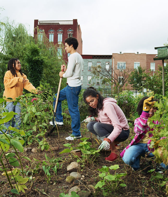 People live in communities all over the world. One reason they live in communities is that they like to be with others. In a community, people feel that they belong. People in a community depend on, or count on, one another. They enjoy working together for a common purpose. A community has workers and businesses that provide citizens with the things they need and want. A community has a government that passes laws and hires people to help keep everyone in the community safe. A community helps people come together and have fun by providing parks, concerts, and parades. A community might have a library, a museum, or a center that celebrates the different cultures of the community. The people shown here enjoy planting and caring for a community garden.