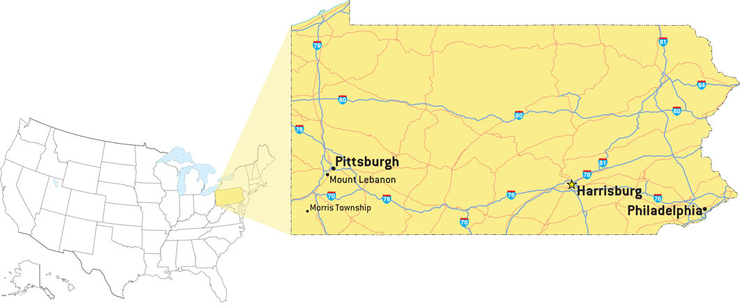 ▲ About 60 miles from Pittsburgh is Morris Township, Pennsylvania. This rural, or country, area has lots of land, including parks and farms. There is even an old covered bridge. Morris Township has a big coal mine, where people work. But only about 800 people live in this community.