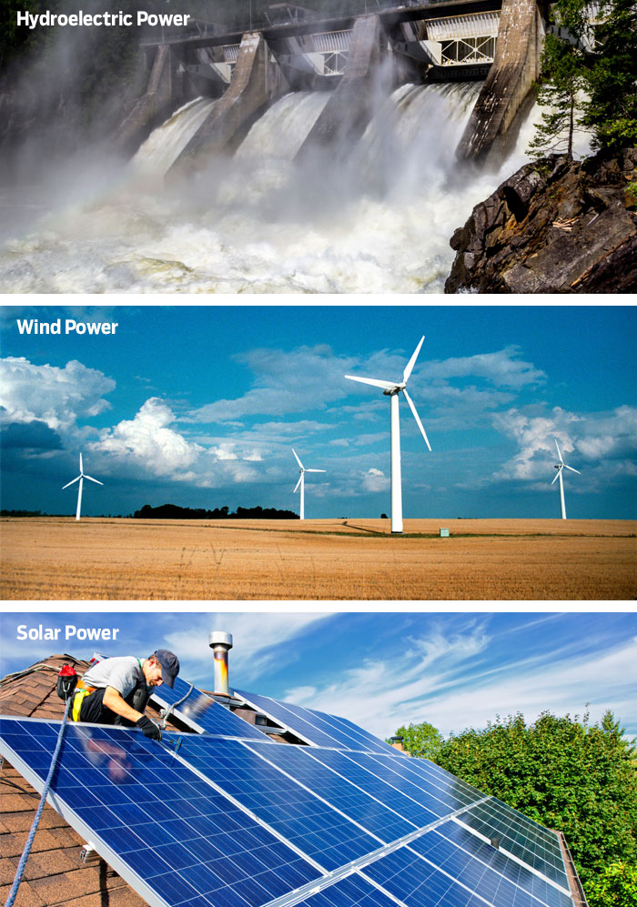 We use electricity for so many things. It lights our homes, streets, schools, and factories. It also powers our factories. More than half the electricity we use comes from coal and oil. These resources are nonrenewable. That means we can’t make any more oil or coal. Burning them also sends literally tons of carbon dioxide into the air every day. In many areas, people are using more renewable energy. Examples are water, wind, and solar power. We don’t burn these power sources, so they keep our skies cleaner. ▼