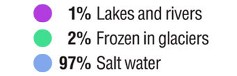 ▲ It looks like there’s a lot of water on Earth. In fact, two-thirds of this planet is covered with water. But only about 1 percent of that water is even close to drinkable. Another 2 percent is frozen in glaciers. Those are like huge ice cubes, and they’re mostly at the North and South Poles. The rest of the water—97 percent—is salty seawater. Desalination means taking the salt out of seawater. It has been around since the time of Aristotle, in the fourth century B.C. There are basically two ways to do it. One is to boil salt water and collect the steam, which has no salt. The other way is to move the salt water through a filter that takes out the salt. The largest desalination plant in the world is in Israel. It provides 20 percent of the country’s fresh water.
