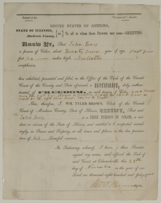 Illinois was brought into the United States as a free state, a state in which slavery was banned. But free Black people were still denied basic freedoms. In 1819, the state passed what became known as the Black Codes. According to the codes, Black people could not vote, and they could be jailed or beaten if they gathered in groups of three or more. Plus, they had to carry a Certificate of Freedom to show they were not enslaved. ▶