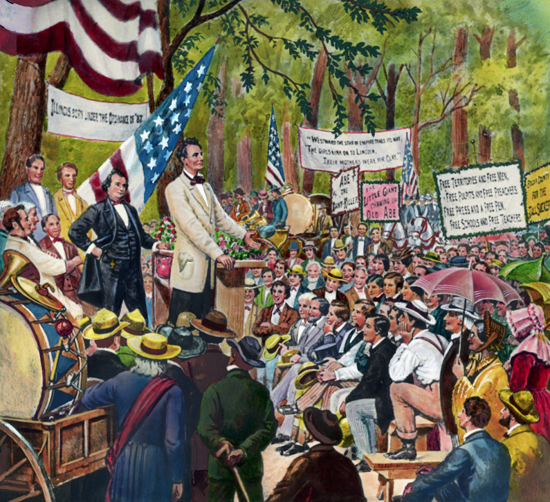 ◀ The year was 1858. Stephen Douglas and Abraham Lincoln both wanted to be the U.S. senator from Illinois. In the months before the election, they took part in seven debates. Slavery was the main topic. Douglas said that each state should decide for itself whether or not to allow slavery. Lincoln’s view was that slavery should not spread to new states or territories at all. Douglas won the debates. But they set Lincoln on a path to becoming president two years later. Shown here is Lincoln speaking at one of the debates.