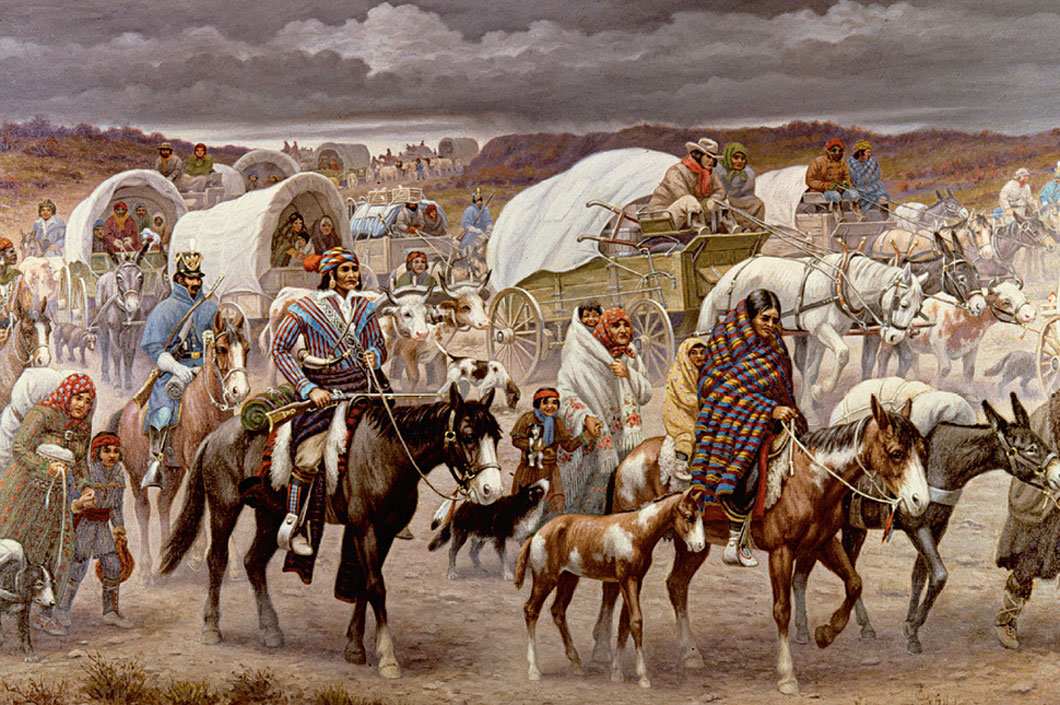 ▲ Most Native Americans supported the British. Many went to Canada. But more and more settlers moved west. Even the tribes that had backed the Patriots lost much of their land after the war. Within 50 years of the Revolution, the U.S. government began moving all Native Americans in the East to lands west of the Mississippi. During the winter of 1838–1839, 16,000 Cherokee men, women, and children were forced to travel the “Trail of Tears.” It took them from their eastern homes to what was called Indian Territory. Now it is called Oklahoma.