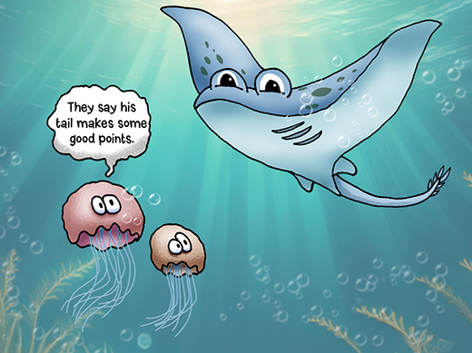 A stingray’s tail may be from 10 inches to 7 feet long. The tail is muscular. It can whip upward and from side to side. This means the stingray feels threatened. The tail of some stingrays is lined with sharp barbs shaped like arrowheads. Each barb can deliver a powerful poison. ▶