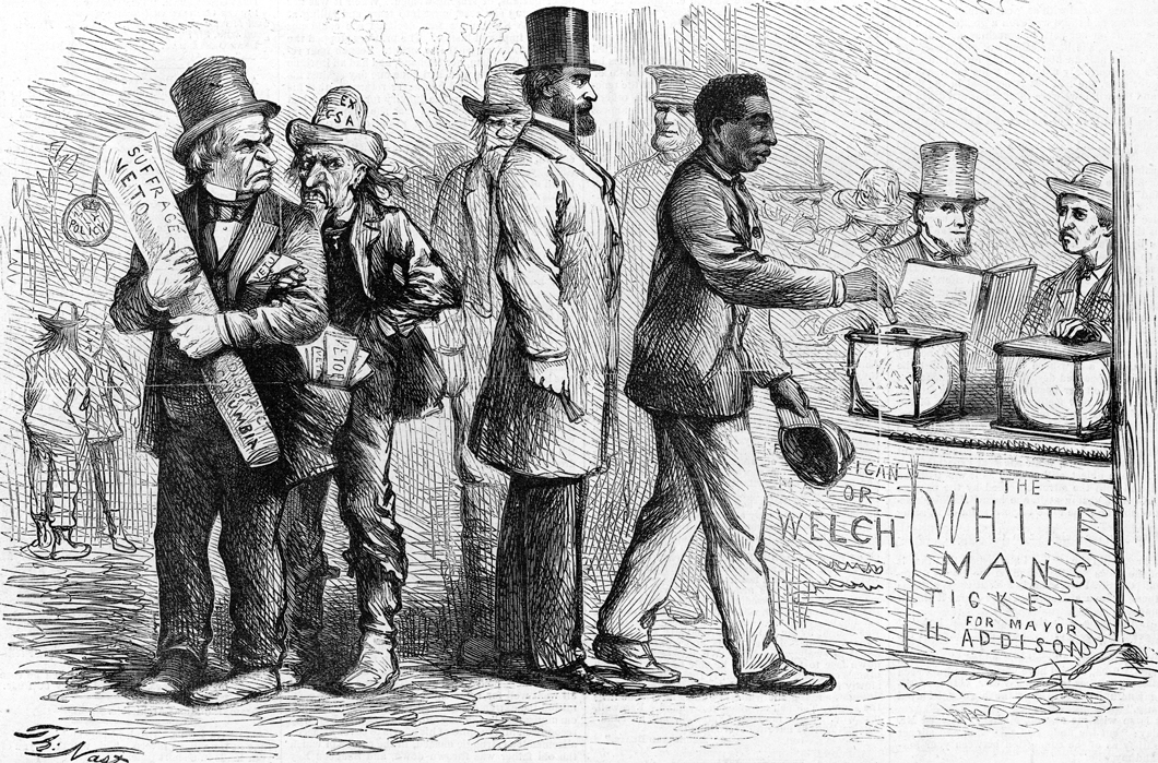 ▲ The 13th Amendment to the Constitution abolished enslavement. The 14th Amendment gave U.S. citizenship to people born (or naturalized) in the U.S. This included formerly enslaved people. A naturalized citizen is someone who is born in one country but becomes a citizen of another country. The 14th Amendment also established that all citizens – including Black people – would have equal protection of the law. The 15th Amendment said that a person could not be denied the right to vote based on race, color, or having ever been enslaved. It set the stage for the Voting Rights Act of 1965.