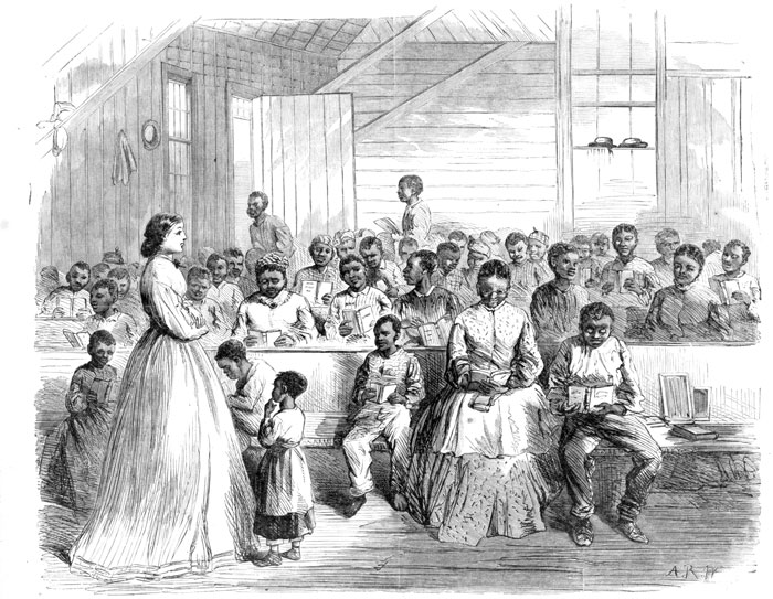 ◀ Before the Civil War, most Black people were prevented from getting an education. After the war, freedmen’s schools were set up. They often had the help of the Freedmen’s Bureau of the U.S. government. Andrew Johnson, who became president after Abraham Lincoln was assassinated, was no “friend” of Reconstruction. And he did not support the Freedmen’s Bureau. One reason was that he didn’t think the U.S. government should be helping one group of people and excluding other groups. People known as Radical Republicans expressed a different point of view: