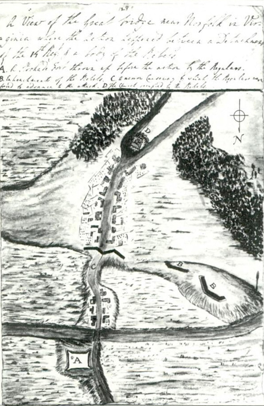 ◀ The British did not give up control of the colonies easily. The Patriots, or colonists who wanted independence, had to fight for it. The first battles took place in the towns of Lexington and Concord in Massachusetts. The date was April 19, 1775. The first battle in Virginia, in December 1775, is known as the Battle of Great Bridge. The Great Bridge over the Elizabeth River was on the main route for supplies coming from North Carolina to Norfolk, Virginia. The battle lasted only half an hour. In the end, the British governor of Virginia had to flee Norfolk. Captain Richard Kidder Meade of the Patriots’ Continental Army described the battle this way: