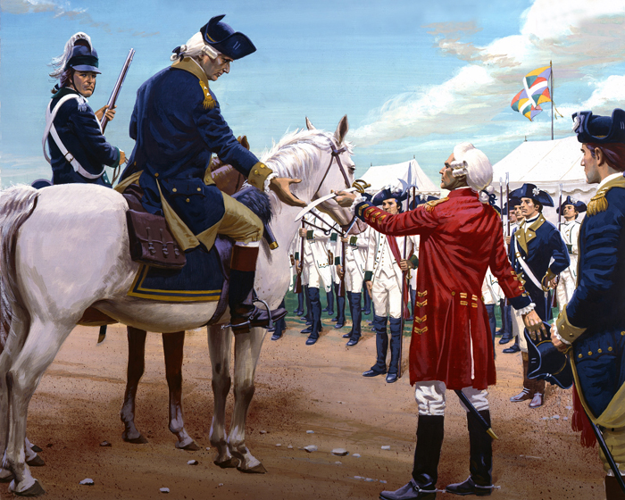 General George Cornwallis surrenders his sword to General George Washington.