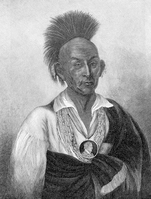 In the early 1800s, settlers wanted land. Land for homes. Land for farms. Land for mining. The U.S. government was there to help. In 1830, Congress passed the Indian Removal Act. The law forced Indigenous peoples to move west of the Mississippi River. Conflicts followed. The Black Hawk War of 1832 was one of them. At the time, Black Hawk (right) was war chief of the Sauk tribe. He led his people to fight against the U.S. Army and local militiamen in Illinois and Wisconsin. (Militiamen were citizens with some military training.) But his group was no match for the Americans. The Battle of Bad Axe near Victory, Wisconsin, on the banks of the Mississippi River, was the last battle between the U.S. government and Indigenous peoples east of the Mississippi River. ▶