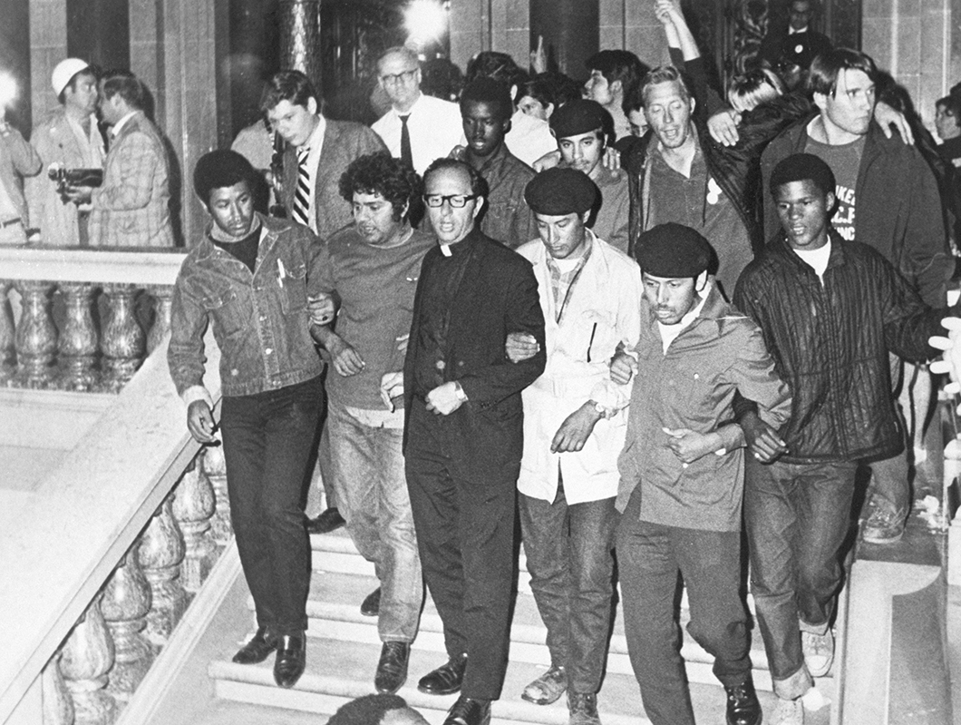 ▲ Milwaukee was a center of protest during the civil rights movement in the 1960s. De facto segregation was the main issue. (De facto segregation is when segregation exists even though it is not required by law.) It affected housing, schools, and jobs. James Groppi, a Catholic priest, and Vel Phillips, the first Black woman elected to the city council in Milwaukee, worked to address racism in the city. Groppi (above, center) led marches every day for 200 days to protest housing discrimination. (Housing discrimination is treating someone looking for a home unfairly because they are different in some way, such as race or religion.) Phillips proposed a fair-housing law. In 1968, Milwaukee passed such a law, and Congress passed the Fair Housing Act, which prohibited housing discrimination nationwide.