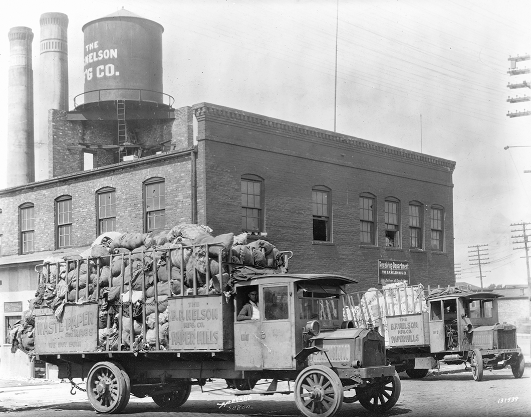 ▲ Papermaking was one of the new industries to spring up in Wisconsin. Paper is produced by making pulp from wood. Pulp is soft, mushy material made by grinding or soaking strands of wood. Wood from forest trees and water from lakes and rivers were key to this process. Both were plentiful in Wisconsin. Milwaukee and Green Bay were early centers of the paper industry. Green Bay still is, living up to its reputation as the “toilet paper capital of the world.”